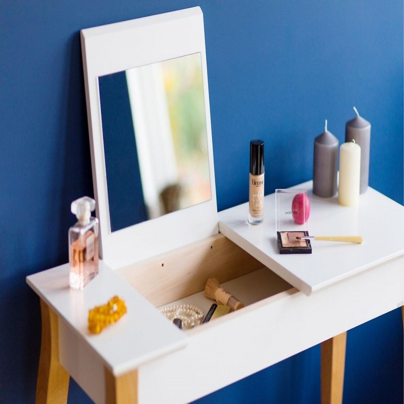 Toaletni stolić izrađen je od bukve te laminiranog i lakiranog MDF-a. To ga čini ne samo lijepo dizajniranim komadom namještaja, već i izdržljivim proizvodom. Noge u boji su završene u elegantnoj crnoj boji, a ploča stola je debela 19 mm, što mu daje čvrst i stabilan izgled.