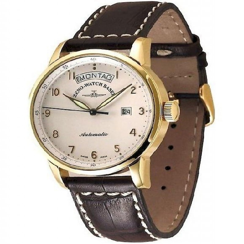 Marka: Zeno Watch Basel Grupa proizvoda: Satovi Ciljna skupina: Muškarci Boja kućišta: Žuto zlato Staklo: Safirno staklo Materijal remena: Koža ≈ mm: 42 Materijal kućišta: Nehrđajući čelik Boja brojčanika: Bijela ≈ Ostalo: Pozadina zaslona Ostalo: Švicarski Zaslon: Analogni Boja remena: Smeđa Premaz: Polirani Oblik kućišta: Okrugli Vrsta sata: Automatski satovi Mehanizam: Automatski Vrsta kopče: Kopča
