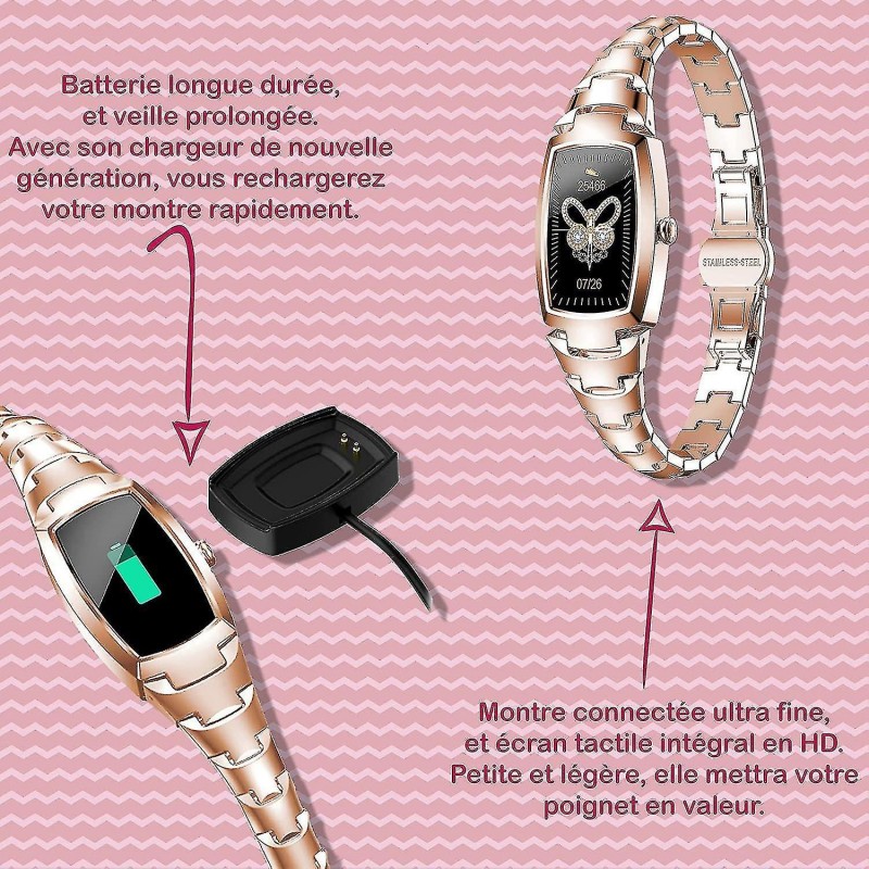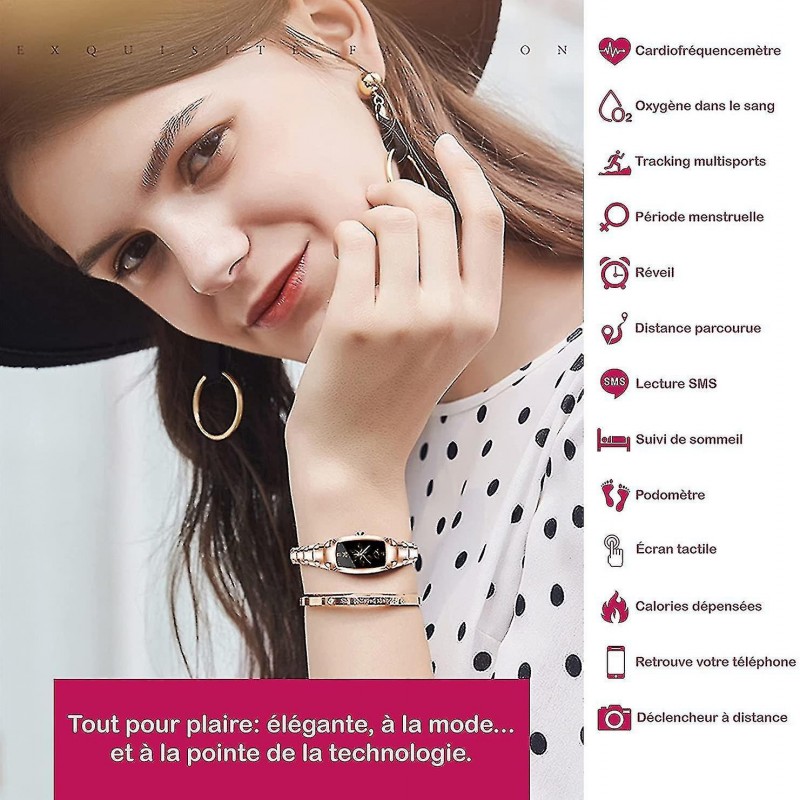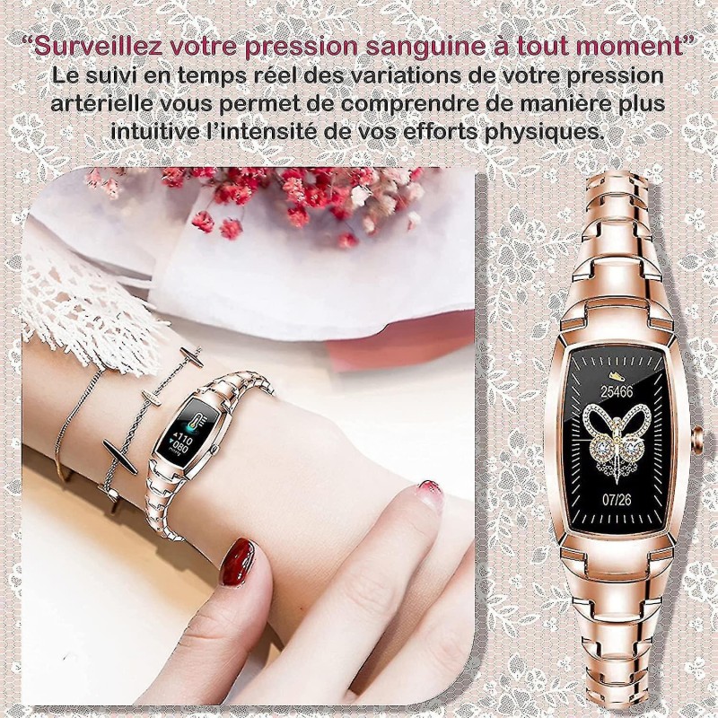 Pametni sat i praćenje zdravlja Ovaj pametni sat točno bilježi cjelodnevne aktivnosti poput koraka, udaljenosti, potrošenih kalorija, otkucaja srca, statusa spavanja i još mnogo toga. Ovaj pametni sat podržava više sportskih načina rada. Nešto što će vas motivirati cijeli dan. Ovaj pametni sat je izvrsna ideja za poklon. Obavijesti o pozivima i porukama Ovi pametni satovi (ružičasto zlato ili srebro) vibriraju kada primate dolazne pozive ili poruke (Facebook, Twitter, WhatsApp, Line, Skype, Twitter, WeChat itd.). Sadržaj poruke možete vidjeti izravno na satu. Ako ste zauzeti, možete izravno prekinuti poziv. Ovi elegantni, visokotehnološki ženski satovi s IP67 zaštitom imaju najpametnije značajke na tržištu, kao što su sinkronizirane vremenske prognoze, podsjetnici za sjedenje, vibracijski budilica, potpuno upravljanje glazbom i kamerom te upravljanje telefonom putem zaslona sata, štoperica, podešavanje svjetline (podignite zglob za posvijetljenje zaslona), magnetsko brzo punjenje i još mnogo toga. Više od samo ženskog sata Ovaj pametni sat ima 1,09-inčni (2,54 cm) IPS HD zaslon osjetljiv na dodir i izrađen je od nehrđajućeg čelika za bolje korisničko iskustvo - a sve to uz zadržavanje elegantnog izgleda. Mjerenje krvnog tlaka, kisika u krvi i menstrualnog ciklusa također su dio aplikacija sata: dobivate sveobuhvatno praćenje. Dugo trajanje baterije i široka kompatibilnost Ženski Bluetooth sat kompatibilan je s Androidom 4.4 ili IOS-om 8.0 i novijim verzijama (potreban je Bluetooth 4.0 ili noviji) i prikladan je samo za povezivanje s pametnim telefonom, a ne s računalom, iPadom ili tabletom. Skenirajte QR kôd ili preuzmite/instalirajte aplikaciju "F Fit" iz trgovine mobilnih aplikacija. Otvorite je i omogućite Bluetooth. Kliknite "Dodaj uređaj" i odaberite sat. Uživajte.