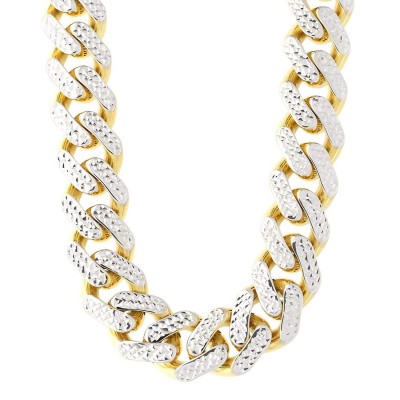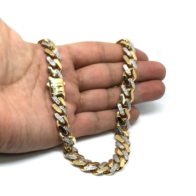 Ovaj Miami Cubanski lančić od 14-karatnog žutog i bijelog zlata nudi moderan izgled ogrlice. Lanac je debeo 11,3 mm i dug 24 inča. Savršen je za privjeske ili se može nositi samostalno. Ima kutijastu kopču s gumbom s obje strane za izdržljivost i udobnost, a mogu ga nositi i muškarci i žene. Ogrlica teži 41,3 grama i označena je kao 14k. - Ovaj lančić izrađen je od pravog 14-karatnog žutog i bijelog zlata i ima odgovarajući metalni žig od 14-karatnog zlata - Ova ogrlica u stilu Miami Cubanskog lančića savršena je za nošenje samostalno ili s privjescima - Ogrlica je široka 11,3 mm - Ogrlica ima kutijastu kopču i polirani završetak za sjajan izgled - Težina ogrlice u gramima: 41,3 g